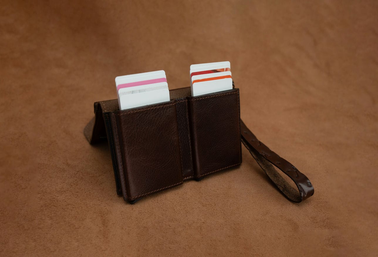 Piniginėje integruoti du aliumininiai mechanizmai, kuriuose telpa iki 14 kortelių (po 7 kiekviename).